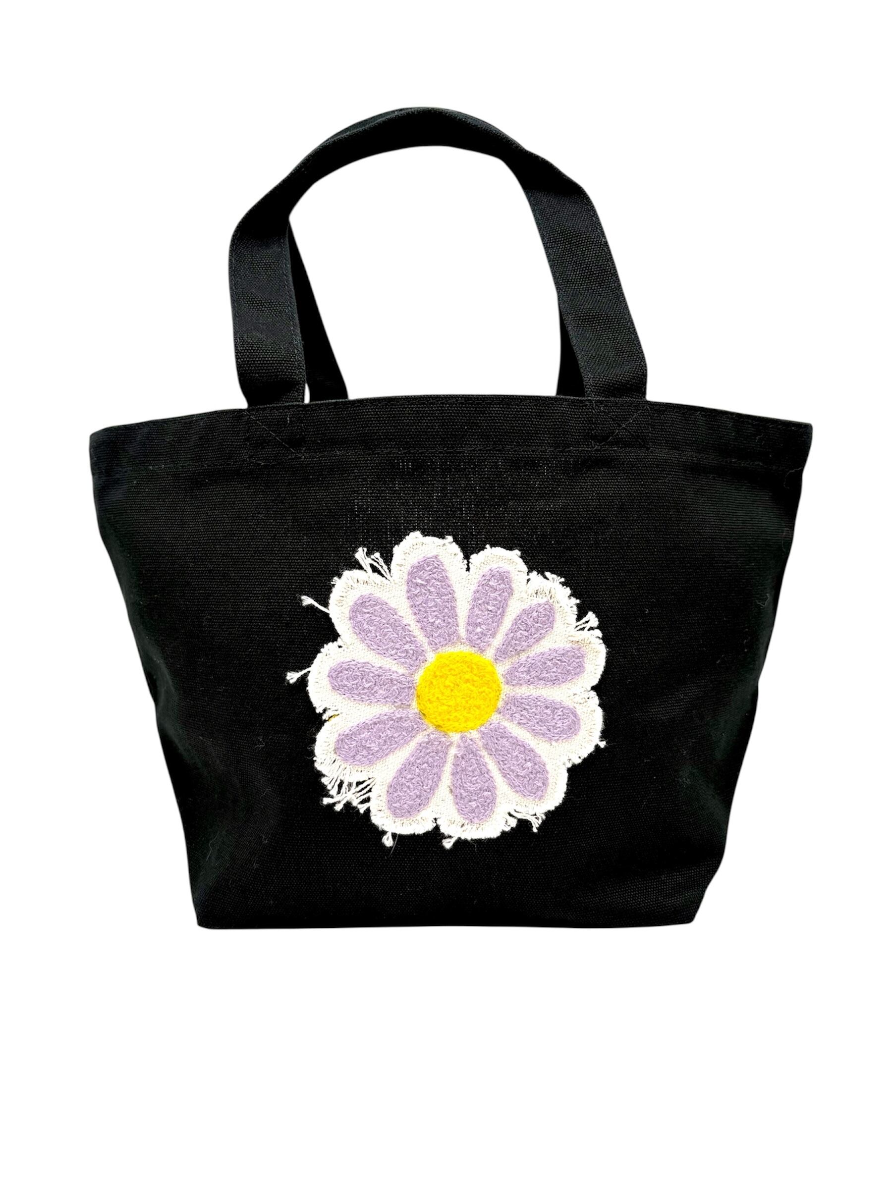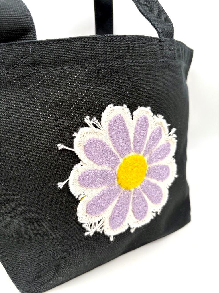 FLOWER刺繍のキャンバスランチバック ブラック花ライトパープル エコバック トート 定番 レディース メンズ ランチバッグ 大きめ キャンバス 無地 布 綿 コットン シンプル おしゃれ かわいい 通学 通勤 お弁当 ランチトート トートバッグ