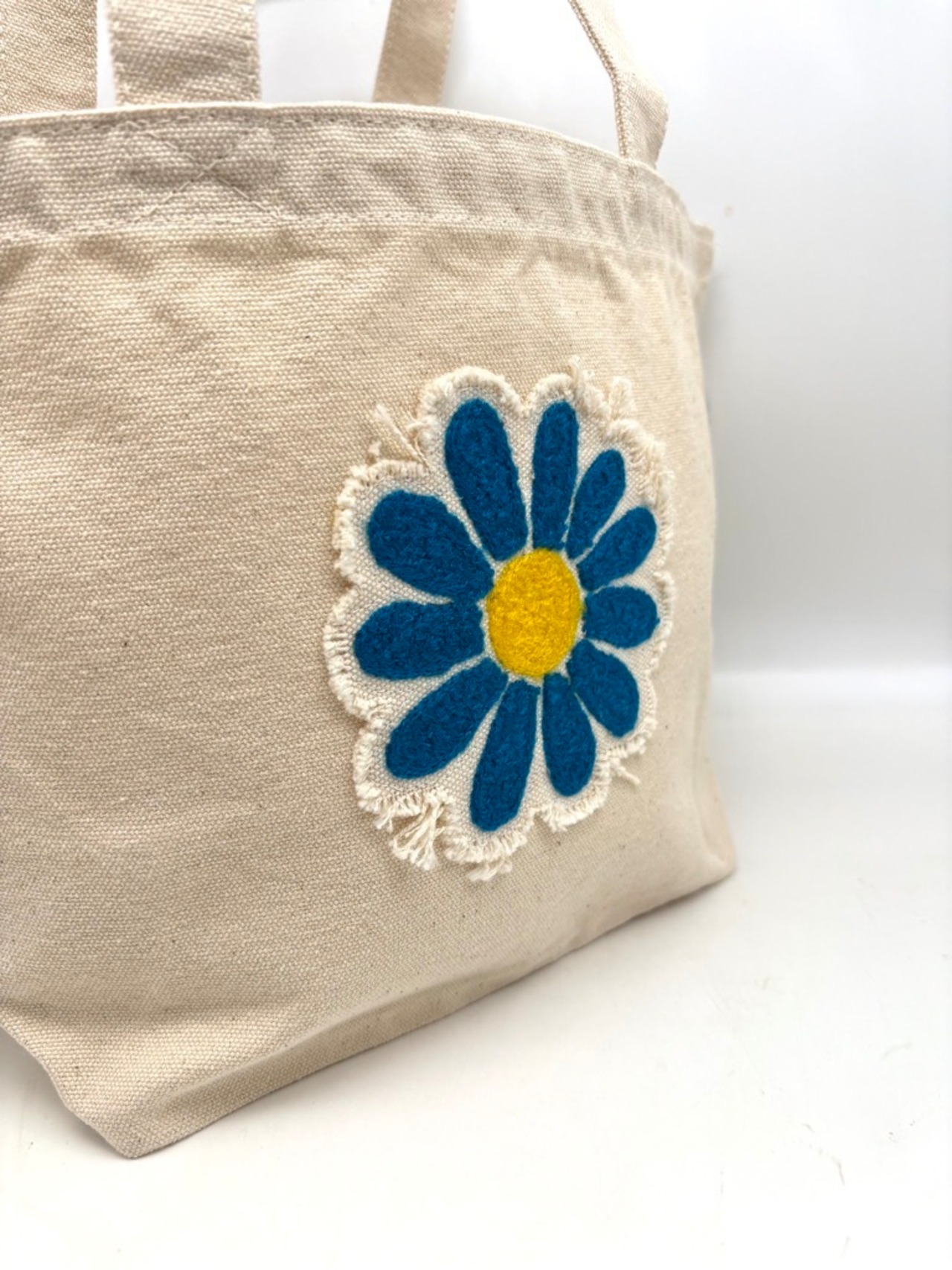 FLOWER刺繍のキャンバスランチバック ナチュラル花ブルー エコバック トート 定番 レディース メンズ ランチバッグ 大きめ キャンバス 無地 布 綿 コットン シンプル おしゃれ かわいい 通学 通勤 お弁当 ランチトート トートバッグ