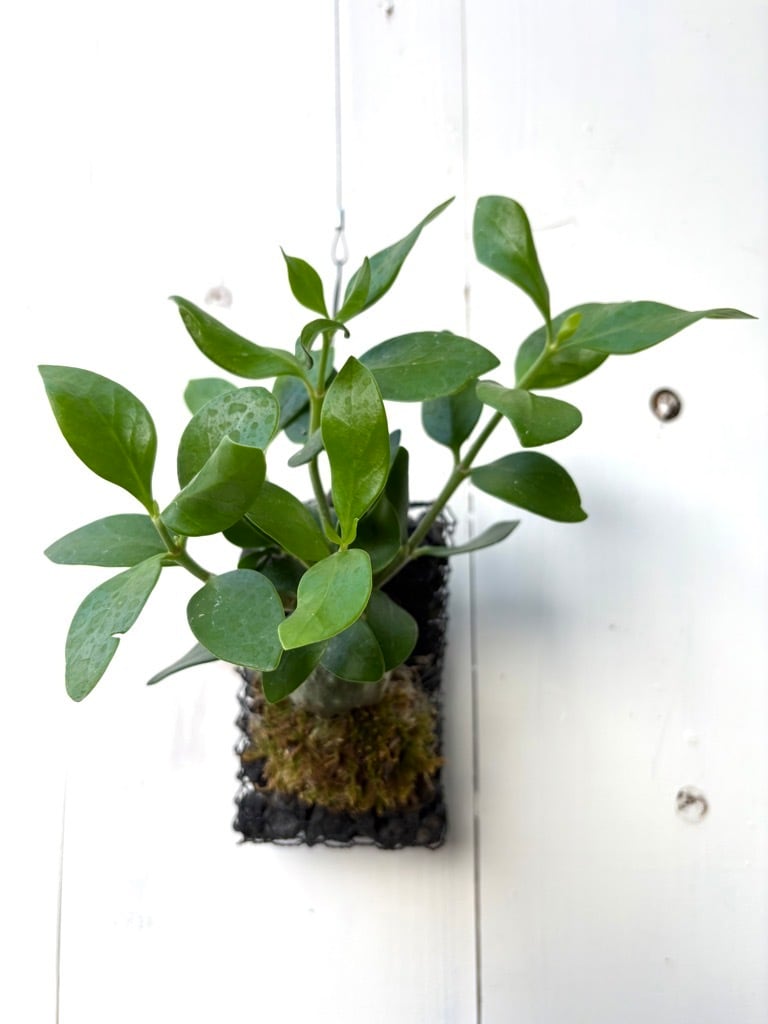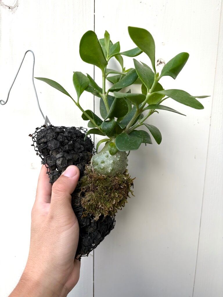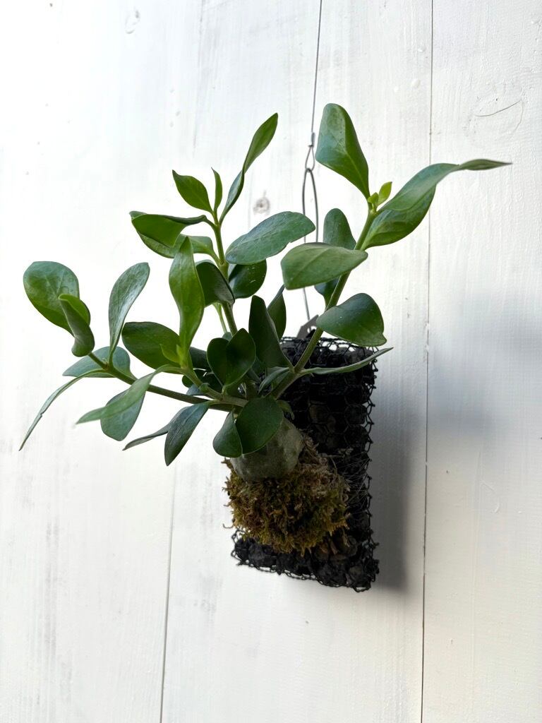 ヒドノフィツム パプアナムは、熱帯雨林に生息するアカネ科の着生塊根植物で、**アリと共生する「アリ植物」として知られています。根元が塊根状に肥大し、内部に迷路状の穴があいており、そこにアリが巣を作り、そのアリのフンや食べ残しを植物が栄養として共生関係を築きます。「アントプランツ」や「蟻の巣玉」**とも呼ばれ、希少なアリ植物として人気があります。